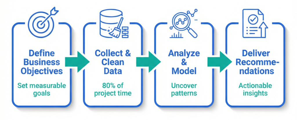 The consulting process typically follows four core stages, each building toward measurable business outcomes.
